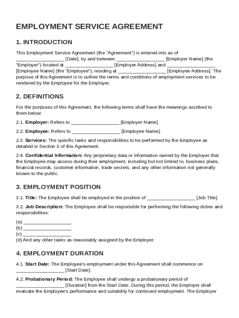An Employment Service Agreement is a formal document that outlines the terms and conditions of employment between an employer and an employee. It serves as a vital tool to ensure clarity on roles, responsibilities, and expectations for both parties. With a comprehensive agreement, potential disputes can be minimized.