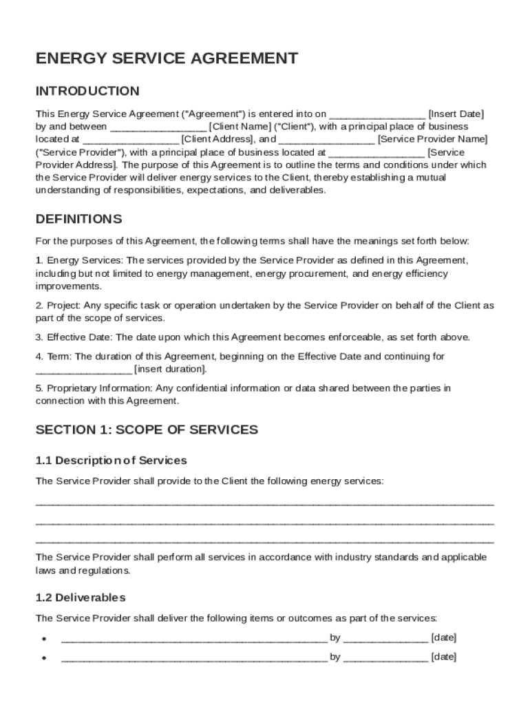 This document outlines the terms and conditions under which energy services are provided by the Service Provider to the Client, detailing the services, obligations, compensation, and other legal provisions.