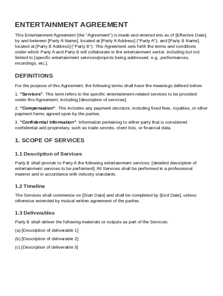 An entertainment agreement outlines the specifics of a working relationship within the entertainment industry, covering performances, recordings, and other related activities.