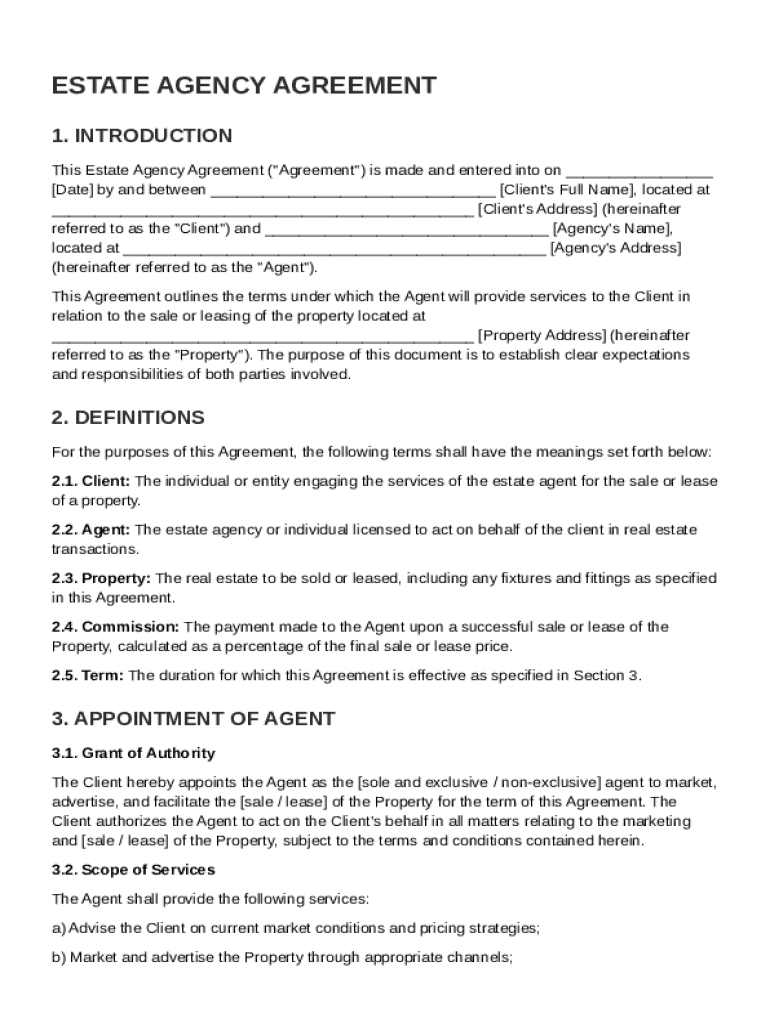 An Estate Agency Agreement is a legal document that outlines the terms and conditions under which an estate agent is authorized to facilitate the buying, selling, or leasing of a property. Its primary purpose is to protect the interests of both the client and the agent while establishing clear expectations. Understanding this agreement is crucial for ensuring a smooth transaction in real estate.