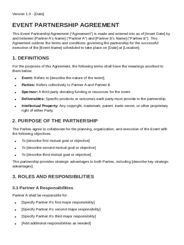 An Event Partnership Agreement Template is a formal document that outlines the terms and conditions between parties collaborating on an event.