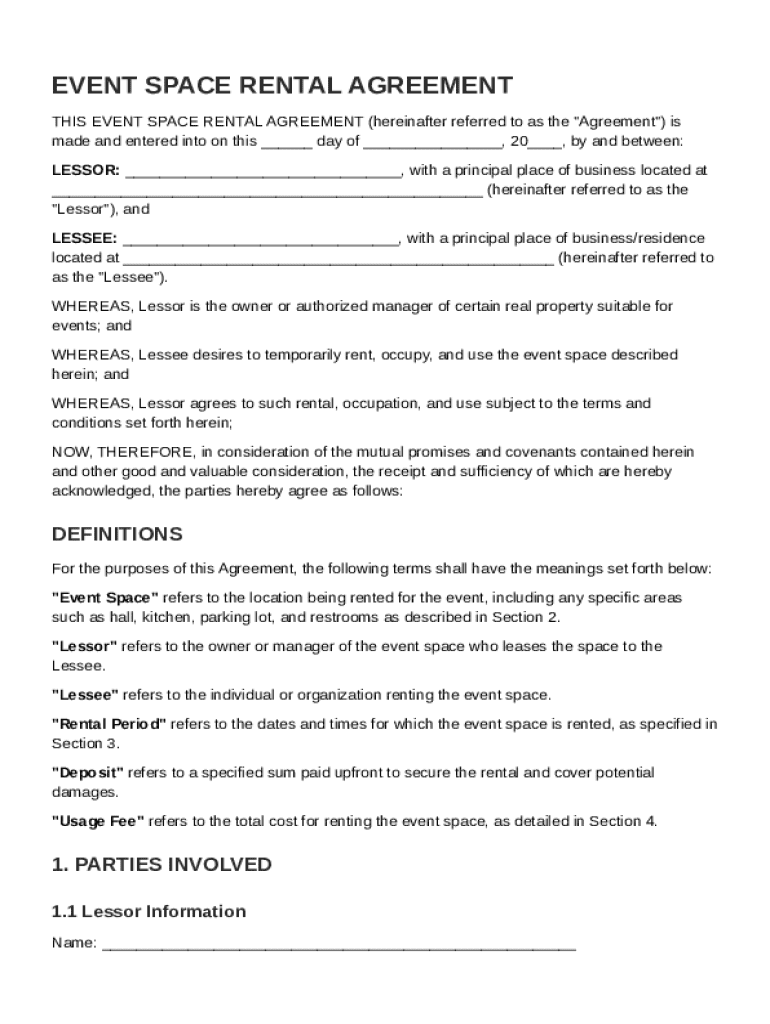 This document outlines the terms and conditions for renting an event space between a Lessor and a Lessee, including definitions, responsibilities, financial terms, cancellation policies, and liability
