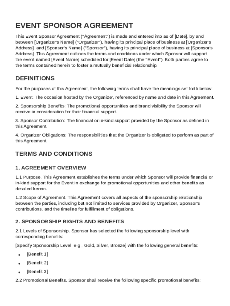 An Event Sponsor Agreement Template is a formal document that outlines the terms and conditions between an event organizer and a sponsor supporting the event.