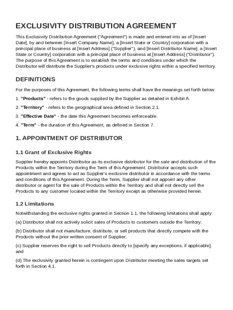 An Exclusivity Distribution Agreement Template is a legal document that outlines the terms under which one party grants another exclusive rights to distribute its products or services within a specific market or location.