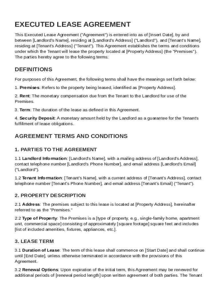 An Executed Lease Agreement Template is a legally binding document that outlines the terms and conditions of a lease agreement between a landlord and tenant after it has been signed by both parties.