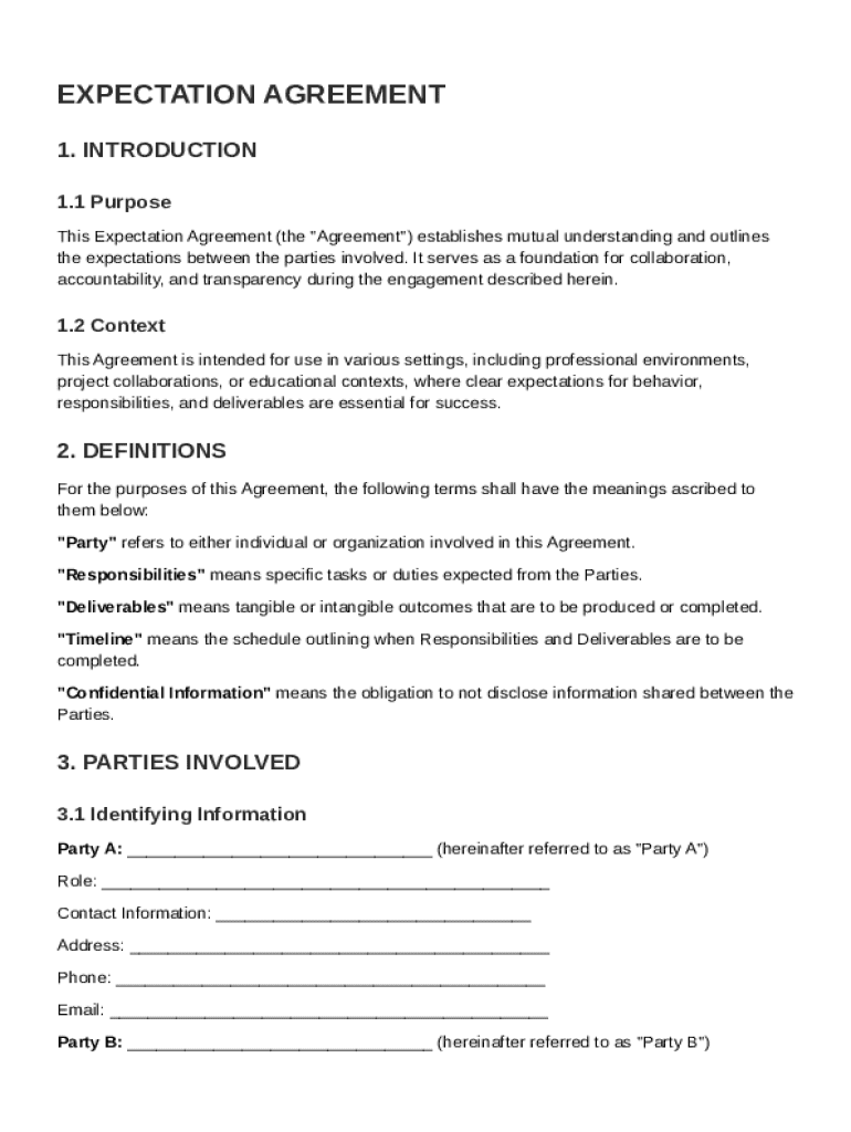 An Expectation Agreement is a structured document that outlines mutual expectations between parties, often in professional or educational contexts. Its purpose is to ensure clarity and accountability among all participants in a collaborative effort. By specifying what each party is responsible for, this agreement helps to prevent misunderstandings and miscommunication.