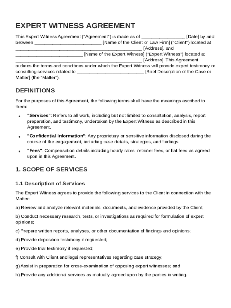 This document outlines the terms and conditions under which an Expert Witness will provide expert testimony or consulting services related to a specific case or matter.