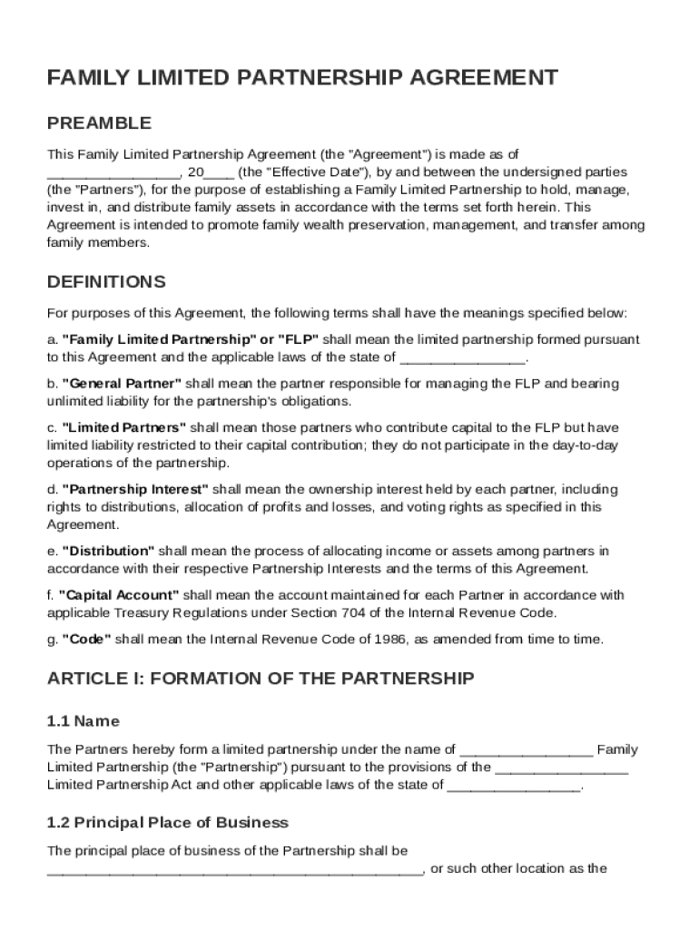 A Family Limited Partnership Agreement Template is a legal document that outlines the structure and terms of a family limited partnership.
