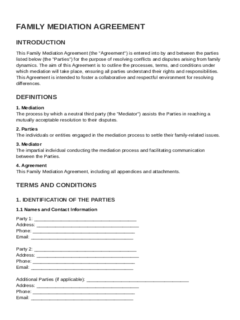 A Family Mediation Agreement Template is a document that outlines the terms and conditions agreed upon by parties involved in a family dispute resolution process.