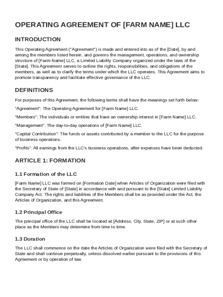 This document outlines the management, operations, and ownership structure of [Farm Name] LLC, detailing the rights, responsibilities, and obligations of its members, as well as governance and financial