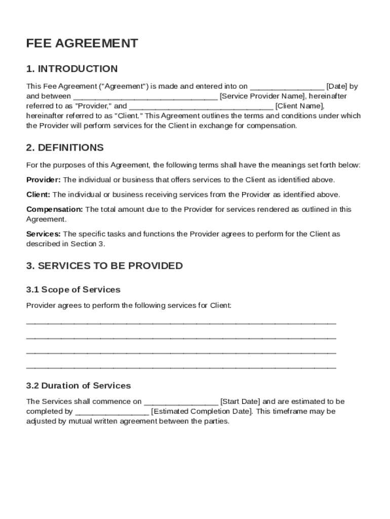 This Fee Agreement outlines the terms and conditions under which the Provider will perform services for the Client in exchange for compensation.