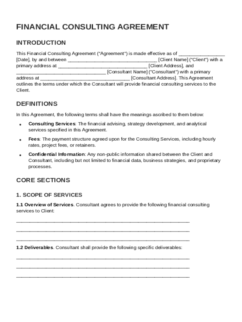 A financial consulting agreement is a legally binding contract that defines the relationship between a consultant and a client. It serves multiple purposes including providing clear guidelines for services offered and ensuring both parties are aligned on expectations. Proper document design is crucial for effective communication and helps mitigate misunderstandings.