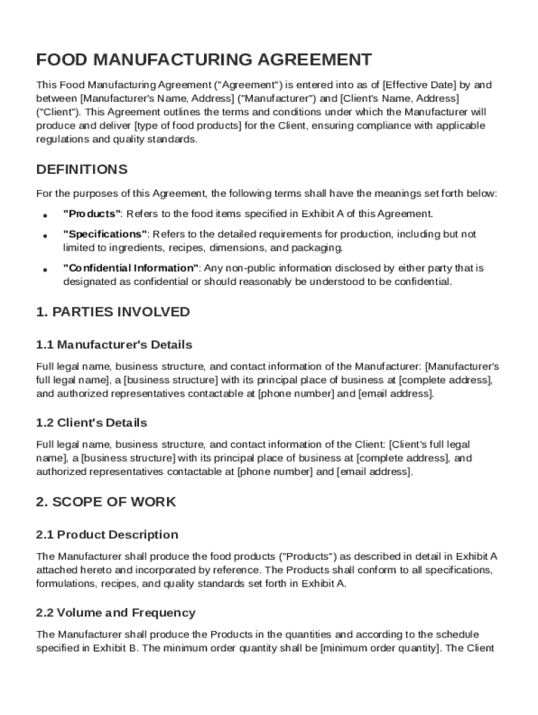 A Food Manufacturing Agreement Template is a contractual document outlining the terms and conditions between food manufacturers and their clients regarding the production and supply of food products.