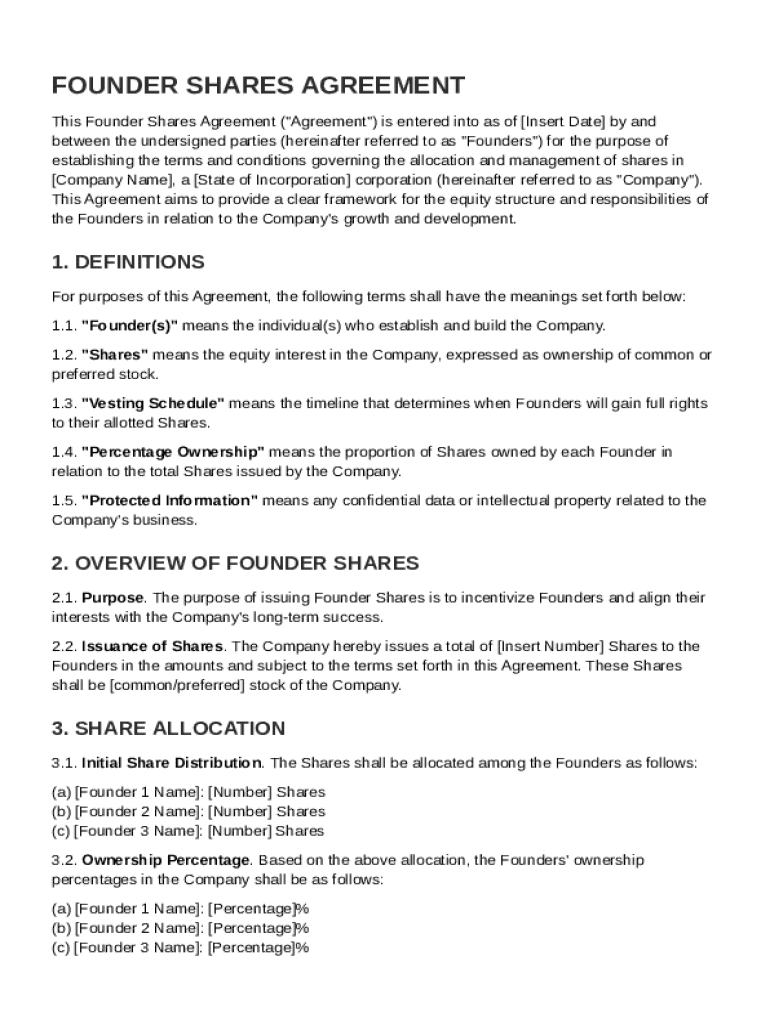A Founder Shares Agreement Template is a legal document outlining the terms of ownership and distribution of shares among the founders of a company.