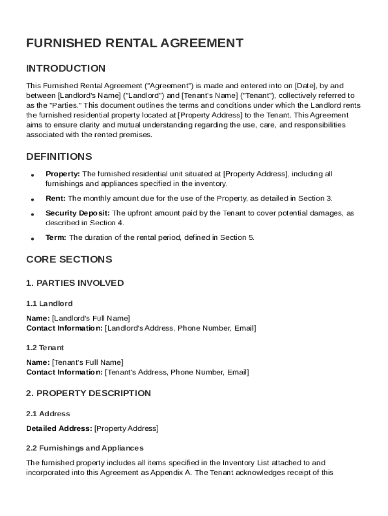 A furnished rental agreement is a contract between a landlord and tenant, specifying the terms of renting a property that includes furniture and appliances. This agreement is important as it clarifies expectations for both parties and protects their respective rights.