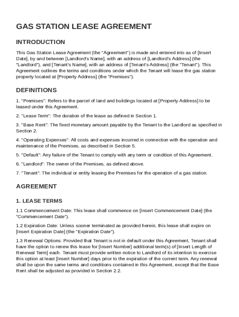 This document outlines the terms and conditions under which a Tenant will lease a gas station property from a Landlord, including details about rent, responsibilities, use of the premises, insurance,