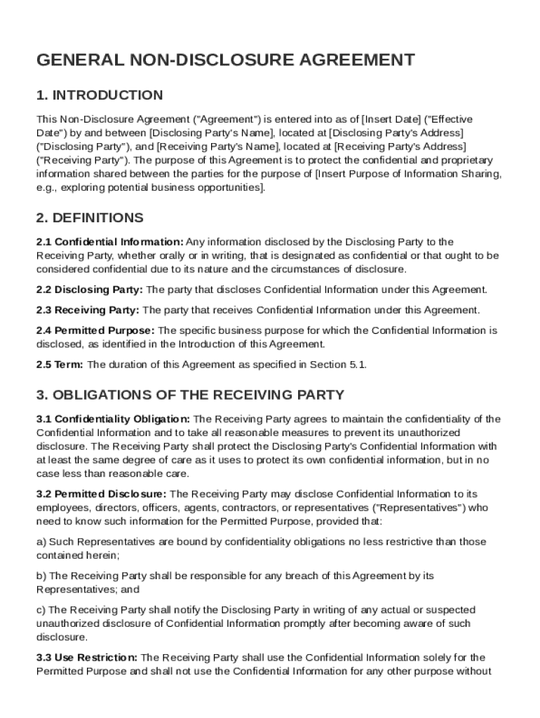 Clauses covering definitions, confidentiality obligations, and the duration of the agreement compose the backbone of an effective NDA.