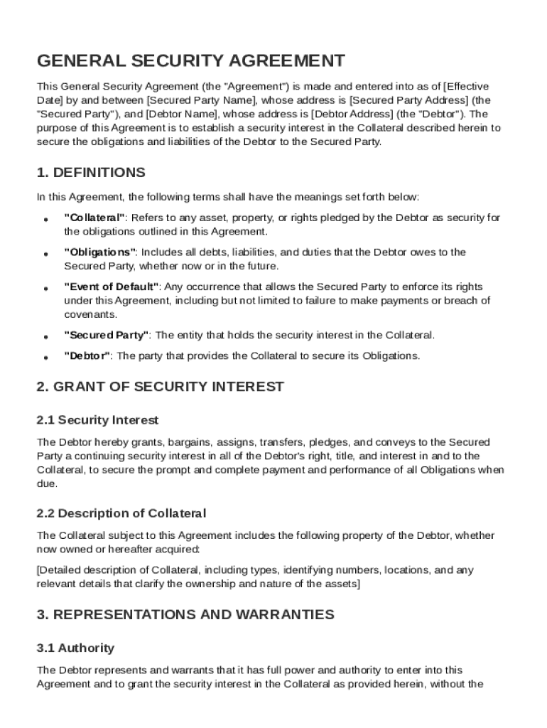 This guide will provide a comprehensive overview and detailed steps for filling out a General Security Agreement Template form. By understanding its essential components and definitions, you can better navigate the process of creating a legally binding document that outlines the security interest for both parties involved.