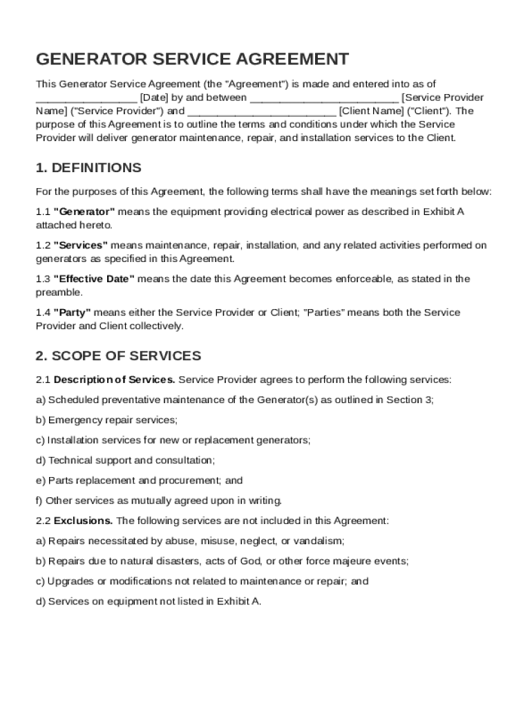 Every Generator Service Agreement needs specific components that define the relationship between the service provider and the client. Key terms like Service Provider, Client, Generator, and Effective Date should be clearly defined to establish a mutual understanding.