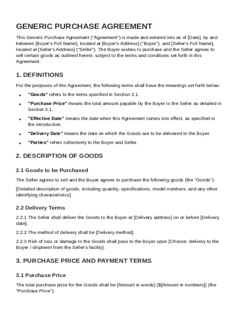 TL;DR: A Generic Purchase Agreement Template form outlines essential terms for buying and selling goods. Complete the form by detailing the parties involved, the goods to be exchanged, pricing, and delivery specifics.