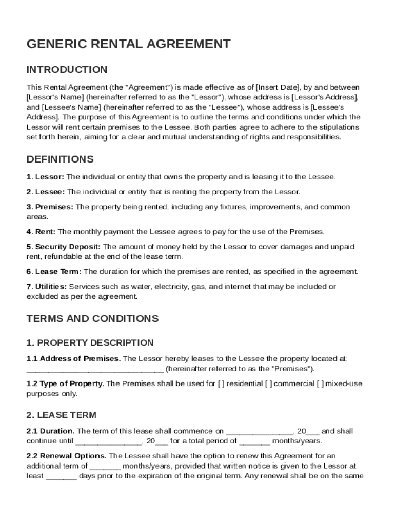 A Generic Rental Agreement Template is a standardized document outlining the terms and conditions of renting a property between a landlord and tenant.