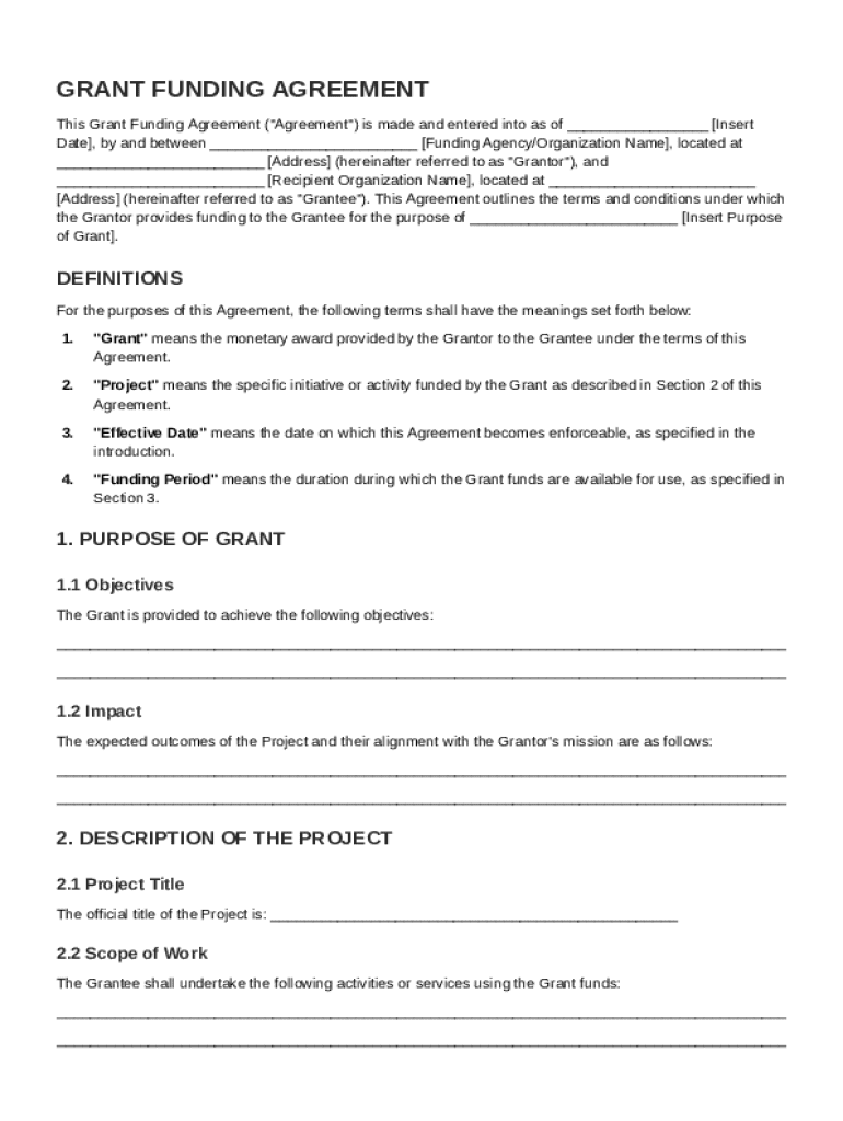 A Grant Funding Agreement is a binding contract that stipulates the terms between a grantor and a grantee. It is vital for defining the relationship, responsibilities, and requirements necessary to ensure that the project funded meets its objectives.