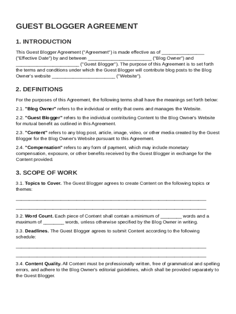 This Agreement outlines the terms and conditions for a Guest Blogger to contribute content to a blog owner\'s website, detailing rights, responsibilities, and compensation.