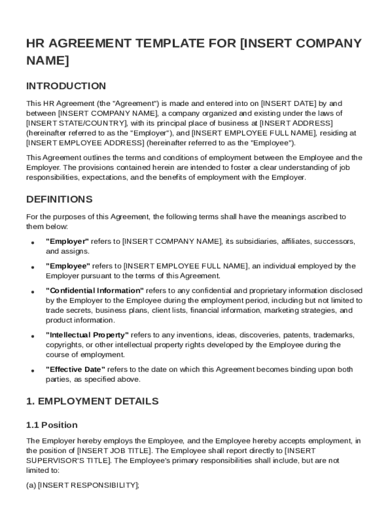 This document serves as a template for an HR Agreement between an employer and an employee outlining the terms and conditions of employment, including roles, responsibilities, compensation, confidentiality,