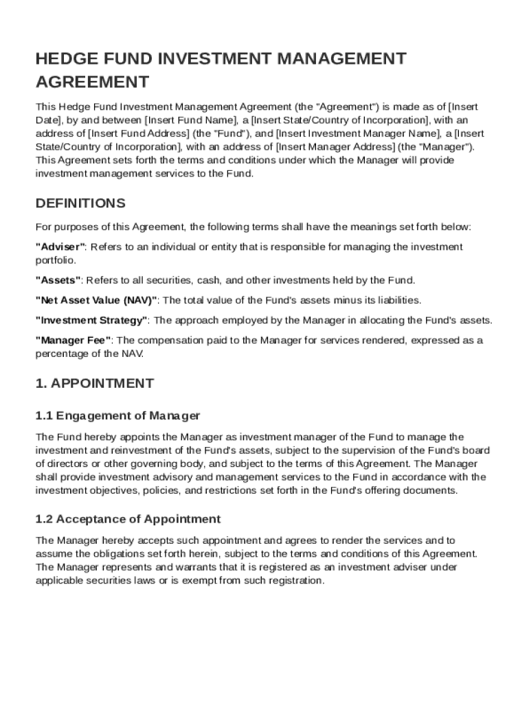 This document serves as an agreement between a hedge fund and its investment manager regarding the management of the fund\'s assets, outlining definitions, compensation, reporting requirements, liability,
