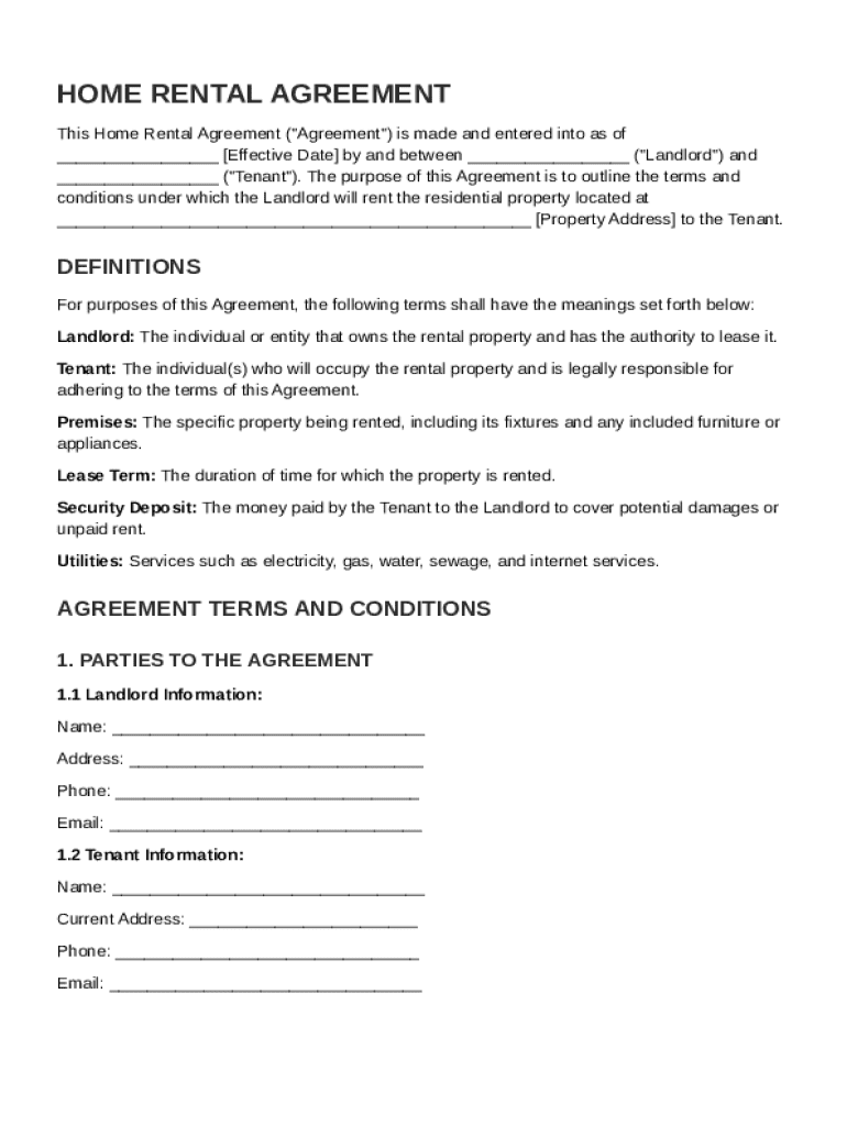 A Home Rental Agreement Template is a legal document that outlines the terms and conditions between a landlord and tenant for renting a residential property.