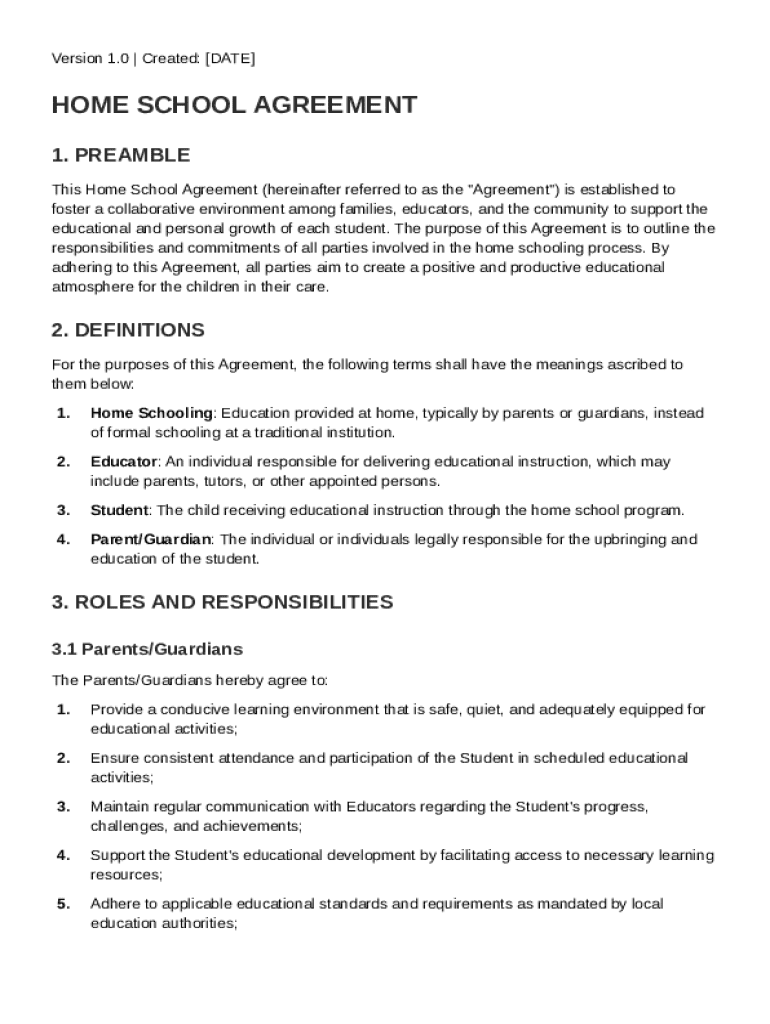 A Home School Agreement Template is a formal document outlining the responsibilities and expectations between parents and educators in a home schooling arrangement.