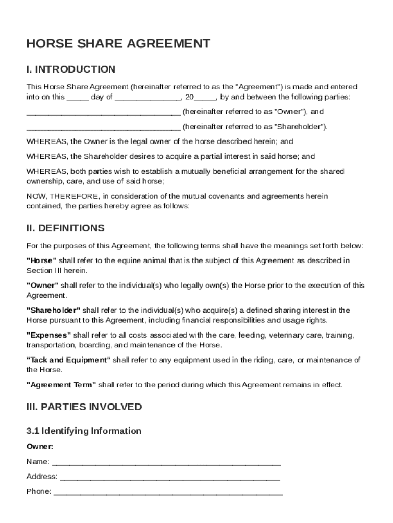 This document outlines the terms of a Horse Share Agreement between an Owner and a Shareholder, detailing the responsibilities, rights, financial arrangements, and care of the horse shared between