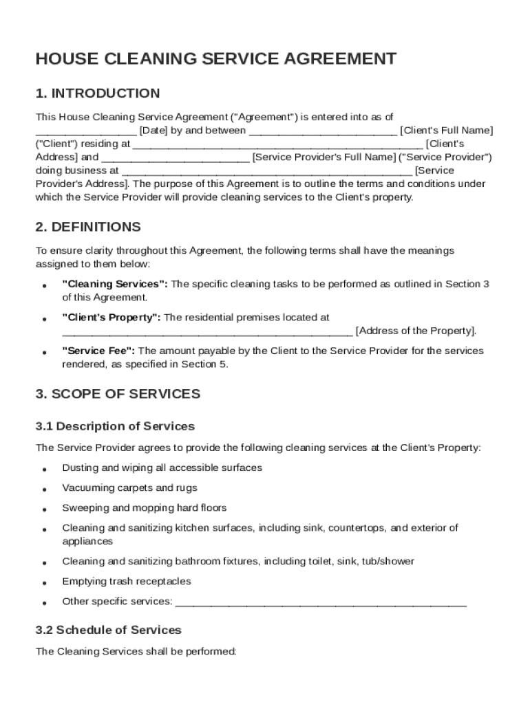 A House Cleaning Service Agreement is a formal document that outlines the terms and conditions between a client and a service provider for cleaning services. This agreement is vital in setting clear expectations and responsibilities for both parties.