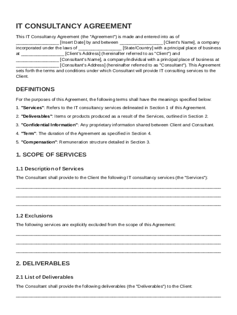 This document outlines the agreement between a Client and a Consultant for the provision of IT consultancy services, detailing the terms and conditions of the services, deliverables, compensation,