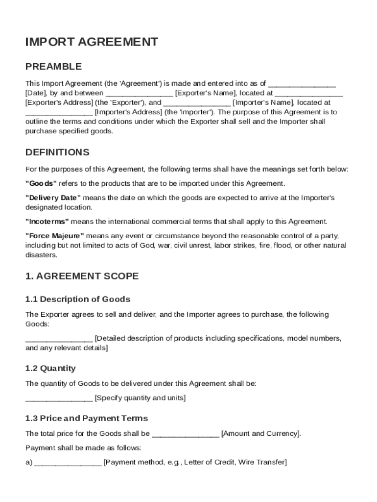 Defining key terms is critical in an Import Agreement as it establishes clear understanding between parties. Terms like Goods, Delivery Dates, and Incoterms play pivotal roles in how the agreement functions.