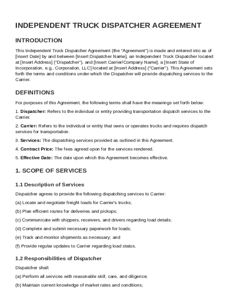 This document formalizes the agreement between an Independent Truck Dispatcher and a Carrier for the provision of dispatching services, detailing the terms, responsibilities, compensation, confidentiality,