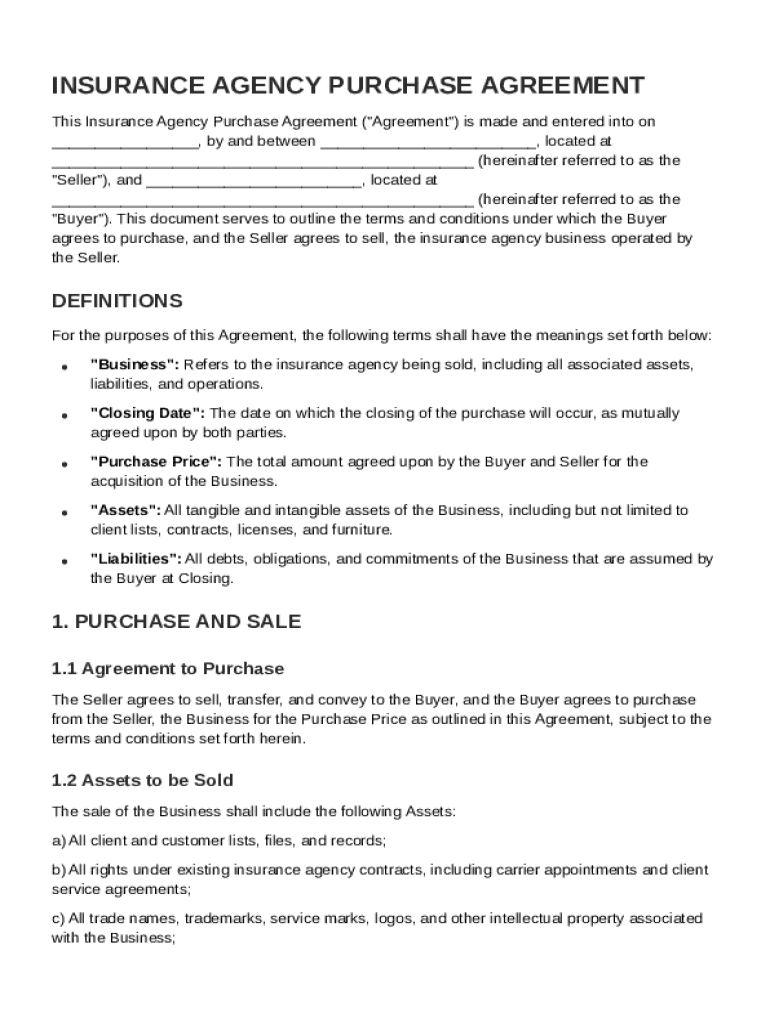 This document outlines the terms and conditions under which a Buyer agrees to purchase, and the Seller agrees to sell, an insurance agency business, detailing definitions, purchase terms, representation,