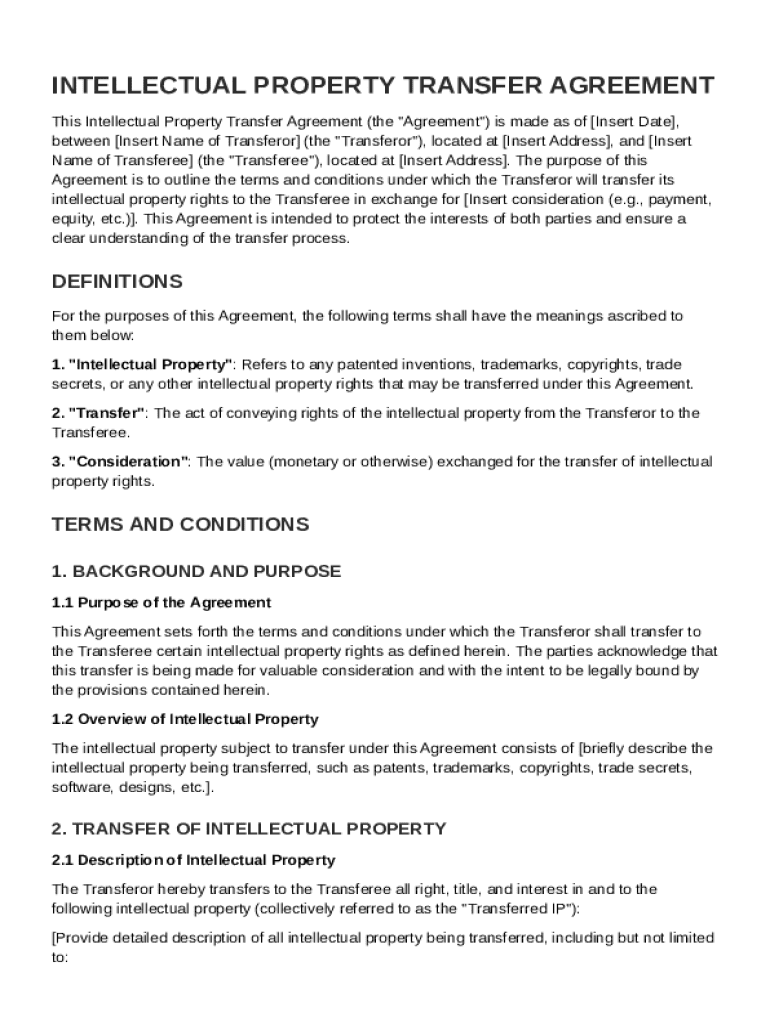 An Intellectual Property Transfer Agreement Template is a legal document used to transfer ownership of intellectual property rights from one party to another.