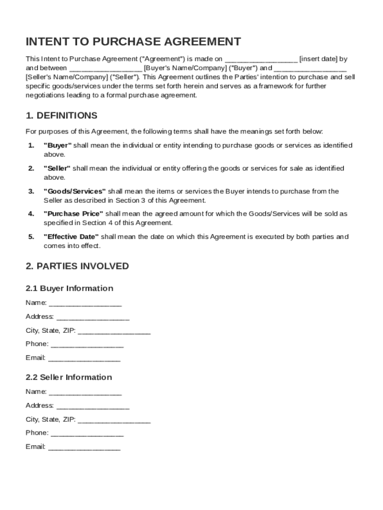 Understanding the core elements of the Intent to Purchase Agreement is crucial for creating a clear and effective document. The fundamental components typically include information about the parties involved, the goods or services being purchased, and details regarding the purchase price.