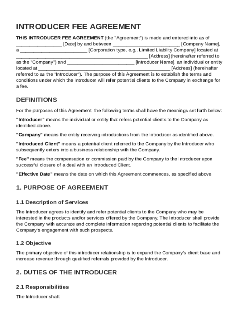 This document is a formal agreement between a company and an introducer that outlines the terms and conditions under which the introducer will refer potential clients to the company in exchange for