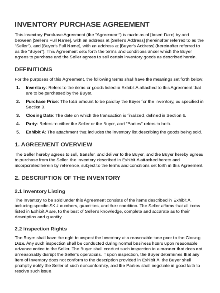 This document outlines the terms and conditions for the purchase of inventory goods between a seller and a buyer.