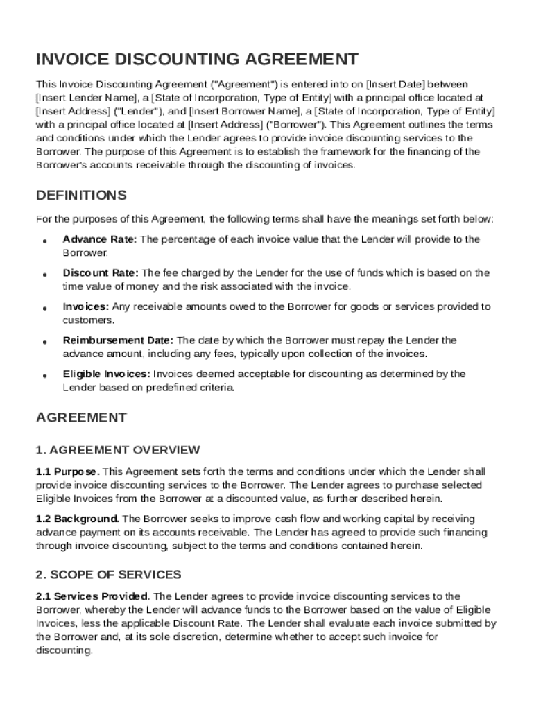 This document outlines the terms and conditions under which a lender provides invoice discounting services to a borrower, including definitions, responsibilities of the parties, fees, and confidentiality.