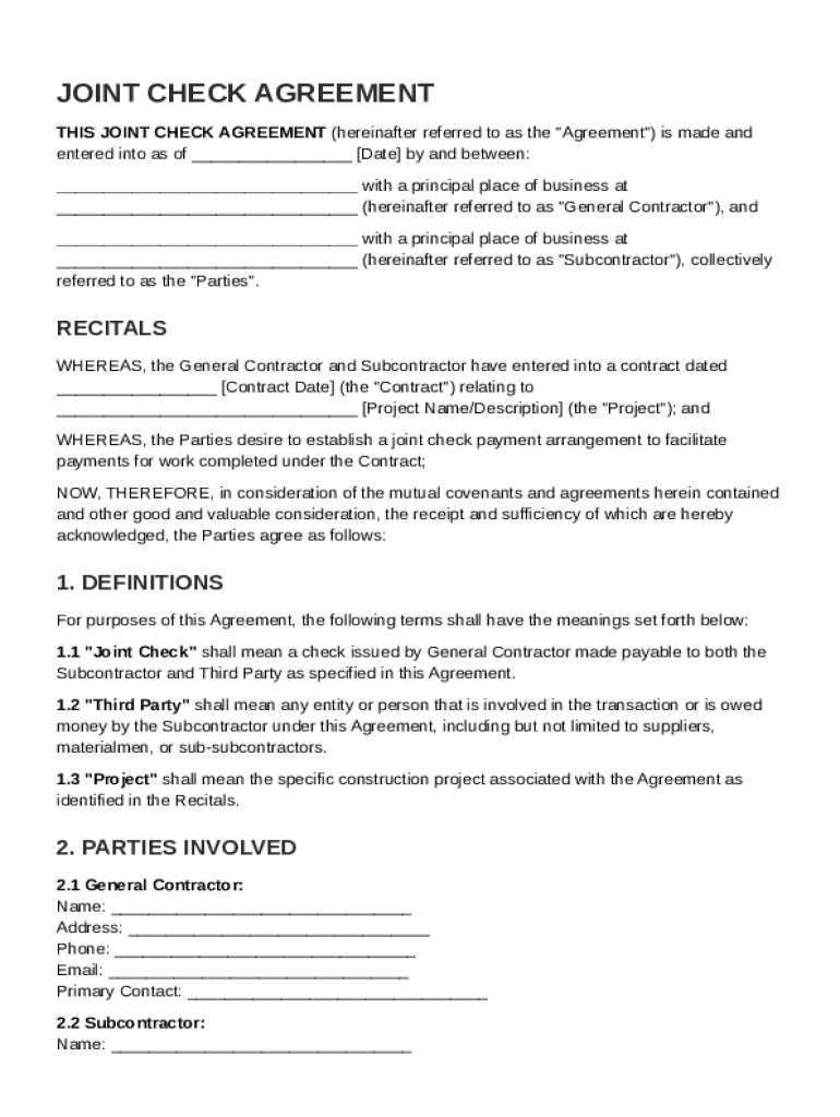 A Joint Check Agreement Template is a legal document that formalizes the arrangement between parties to ensure that payment for services or goods is made jointly to protect all involved parties.