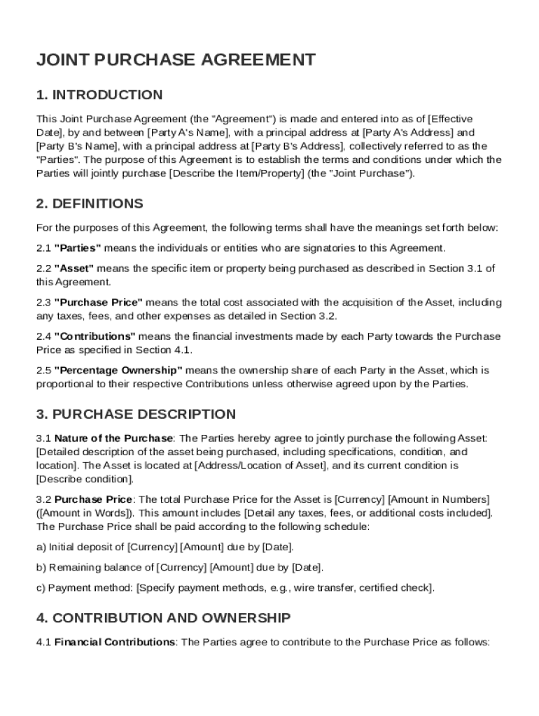 This document outlines the terms and conditions under which two parties agree to jointly purchase a specific asset, detailing financial contributions, ownership percentages, rights and responsibilities,