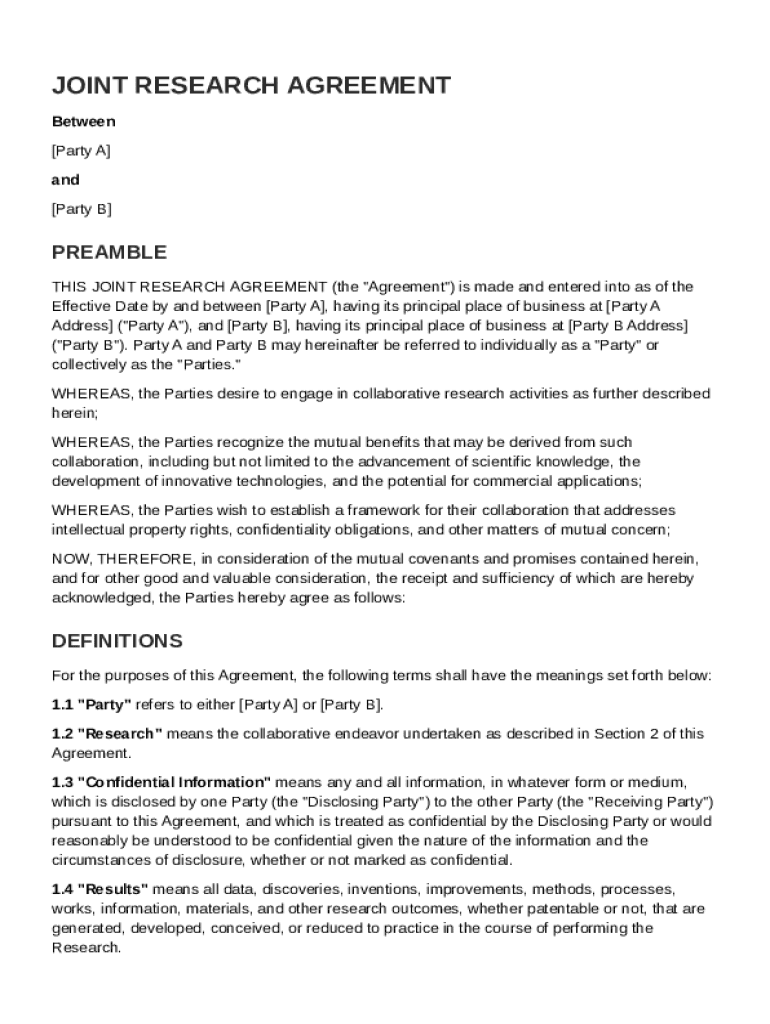 A Joint Research Agreement (JRA) is a powerful tool used to outline the terms of collaboration between multiple parties in a research project. It plays a crucial role in establishing clear guidelines and responsibilities, ensuring that all parties understand their roles, rights, and obligations. This detailed guide will provide insights into the key components of a JRA and the best practices for filling out the template form effectively.