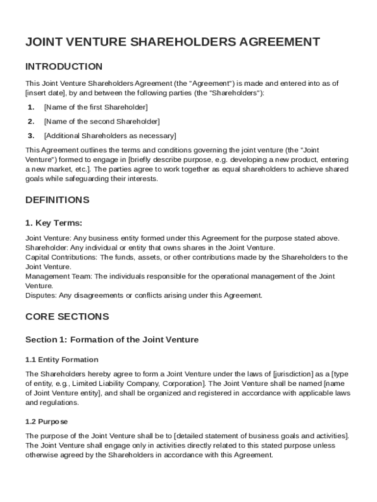 A well-structured Joint Venture Shareholders Agreement should include several key sections, such as the introduction, definitions, parties to the agreement, governance structure, financial commitments, and exit conditions. Each section plays a significant role in outlining the operational framework of the joint venture and protecting stakeholder interests.