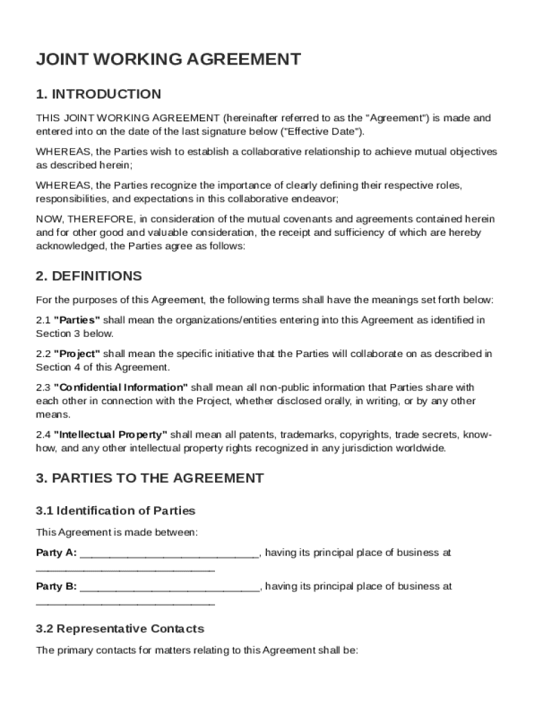 A Joint Working Agreement Template is a formal document outlining the collaboration terms between two or more parties for a specific project or initiative.