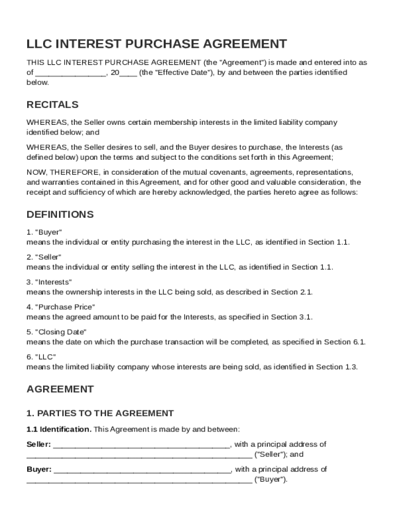 Clearly define terms to avoid ambiguities; for instance, 'Interests' refer to ownership shares, 'Purchase Price' is the agreed sale amount, and 'Closing Date' signifies when the transaction finalizes.