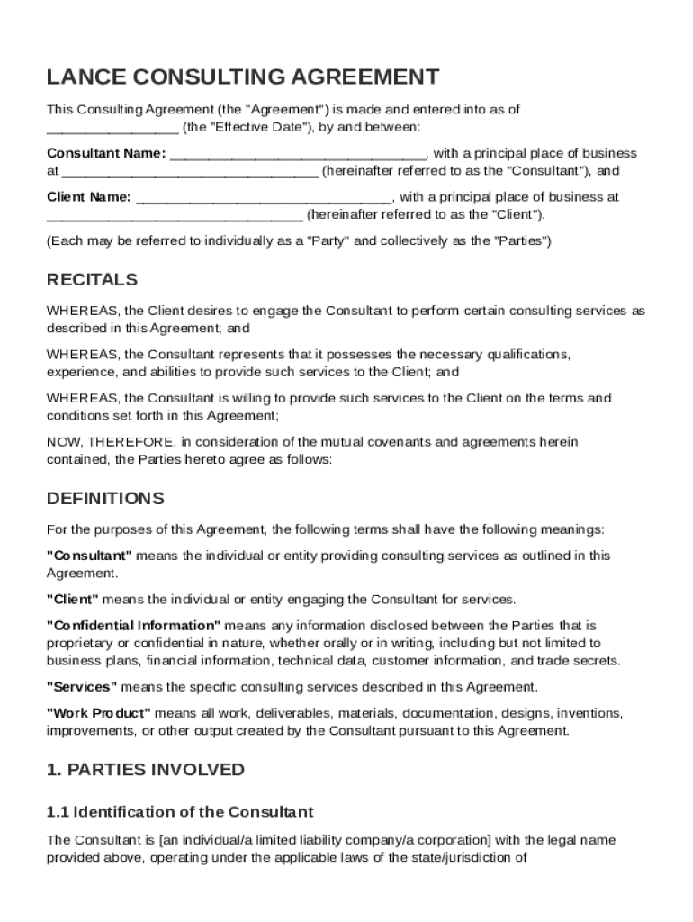 The Lance Consulting Agreement Template is a legal document that establishes the terms of engagement between a consultant and a client.