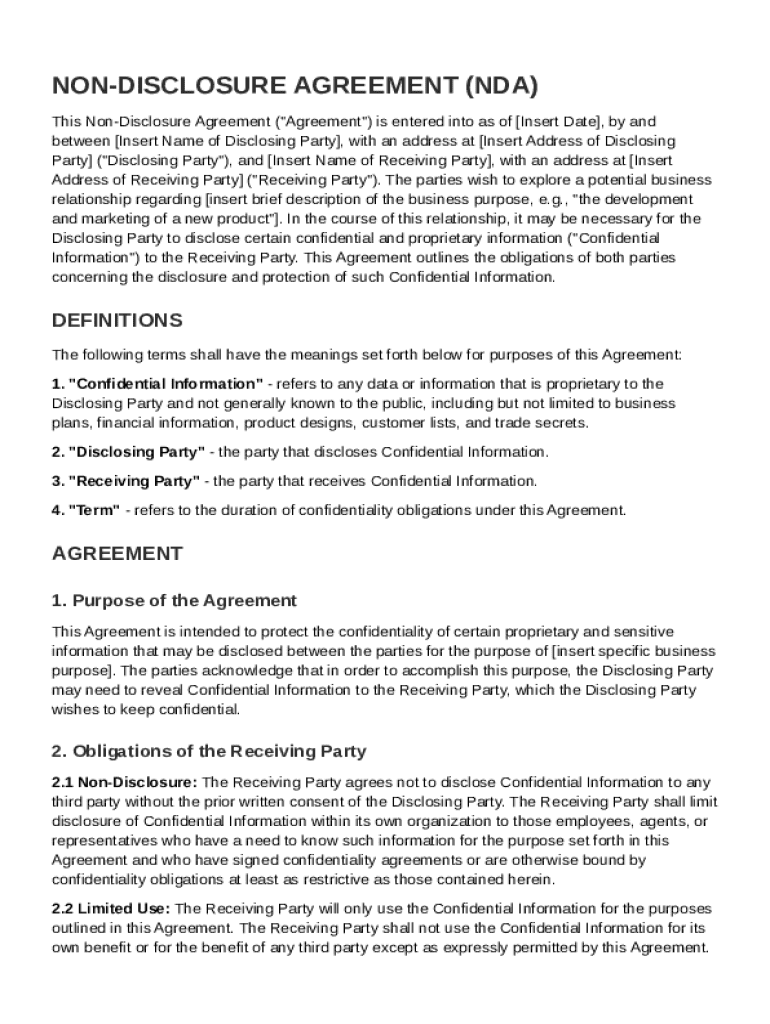 A Non-Disclosure Agreement (NDA) is a legally binding contract that establishes a confidential relationship between the parties involved. It is critical in business relationships for safeguarding sensitive information such as trade secrets, proprietary knowledge, and other confidential data. Without a properly defined NDA, sensitive ideas and information may be exposed, leading to potential financial losses or competitive disadvantages.